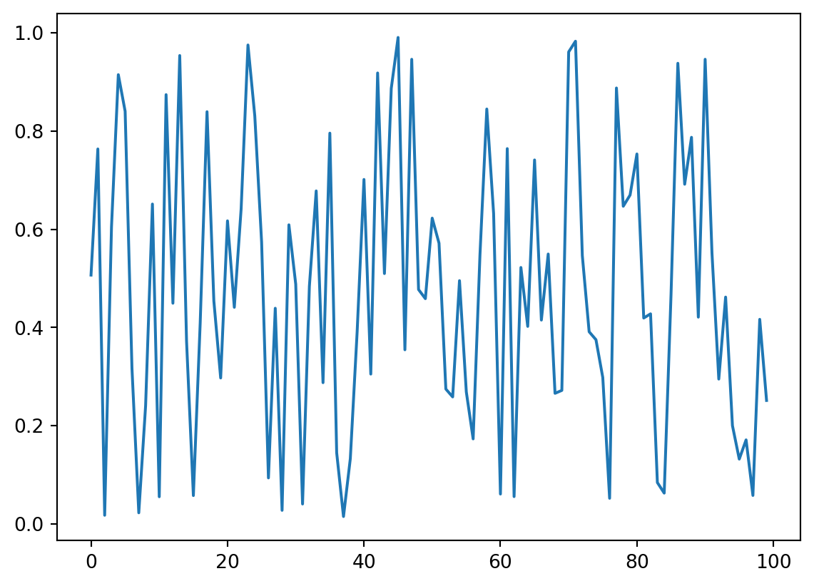 import numpy as npimport matplotlib.pyplot as pltx = np.random.random(100) # 100 random numbers between 0 and 1plt.plot(x)plt.show()