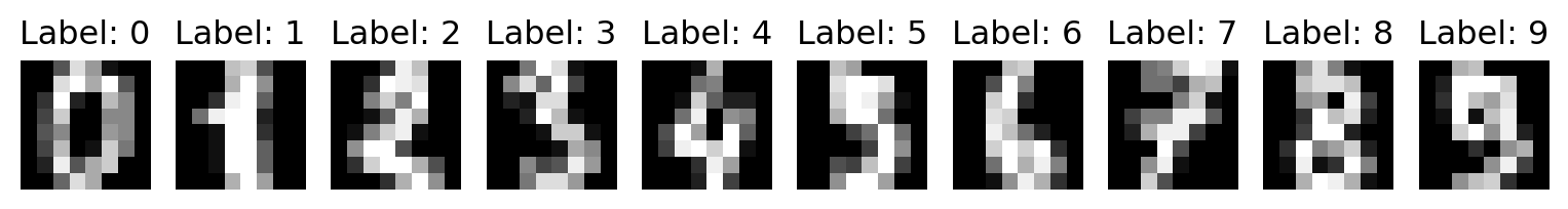 import numpy as npfrom sklearn.datasets import load_digitsfrom sklearn.neural_network import MLPClassifierd = load_digits()digits = d["data"] #1,797 rows, with 64 columns per row, labels = d["target"] #you can name targets instead of labels. a vector of 1,797 digit labels.N =200#number of test samplesK =10# You can adjust this to visualize more or fewer digitsplt.figure(figsize=(10, 2)) # Adjust the figure size as neededfor i inrange(K): plt.subplot(1, K, i +1) plt.imshow(digits[i].reshape(8, 8), cmap='gray') plt.title(f"Label: {labels[i]}") plt.axis('off')plt.show()idx = np.argsort(np.random.random(len(labels))) #randomly shuffle the datax_test, y_test = digits[idx[:N]], labels[idx[:N]] #about 20 of each digit for testing.x_train, y_train = digits[idx[N:]], labels[idx[N:]] #approximately 160 images of each digit to train clf = MLPClassifier(hidden_layer_sizes=(128,)) #one hidden layer with 128 neurons, output layer size is deduced from y_train. This is called one instance of the model.clf.fit(x_train, y_train) #train the model. the learned weights and biases are in the model clf.score = clf.score(x_test, y_test)pred = clf.predict(x_test)err = np.where(y_test != pred)[0]print("score : ", score)print("errors:")print(" actual : ", y_test[err])print(" predicted: ", pred[err])# Print the weights and biasesprint("Weights between layers:")for i, coef inenumerate(clf.coefs_):print(f"Layer {i +1} to Layer {i +2} weights shape: {coef.shape}")print(coef)print("\nBiases for each layer:")for i, intercept inenumerate(clf.intercepts_):print(f"Layer {i +2} biases shape: {intercept.shape}")print(intercept)